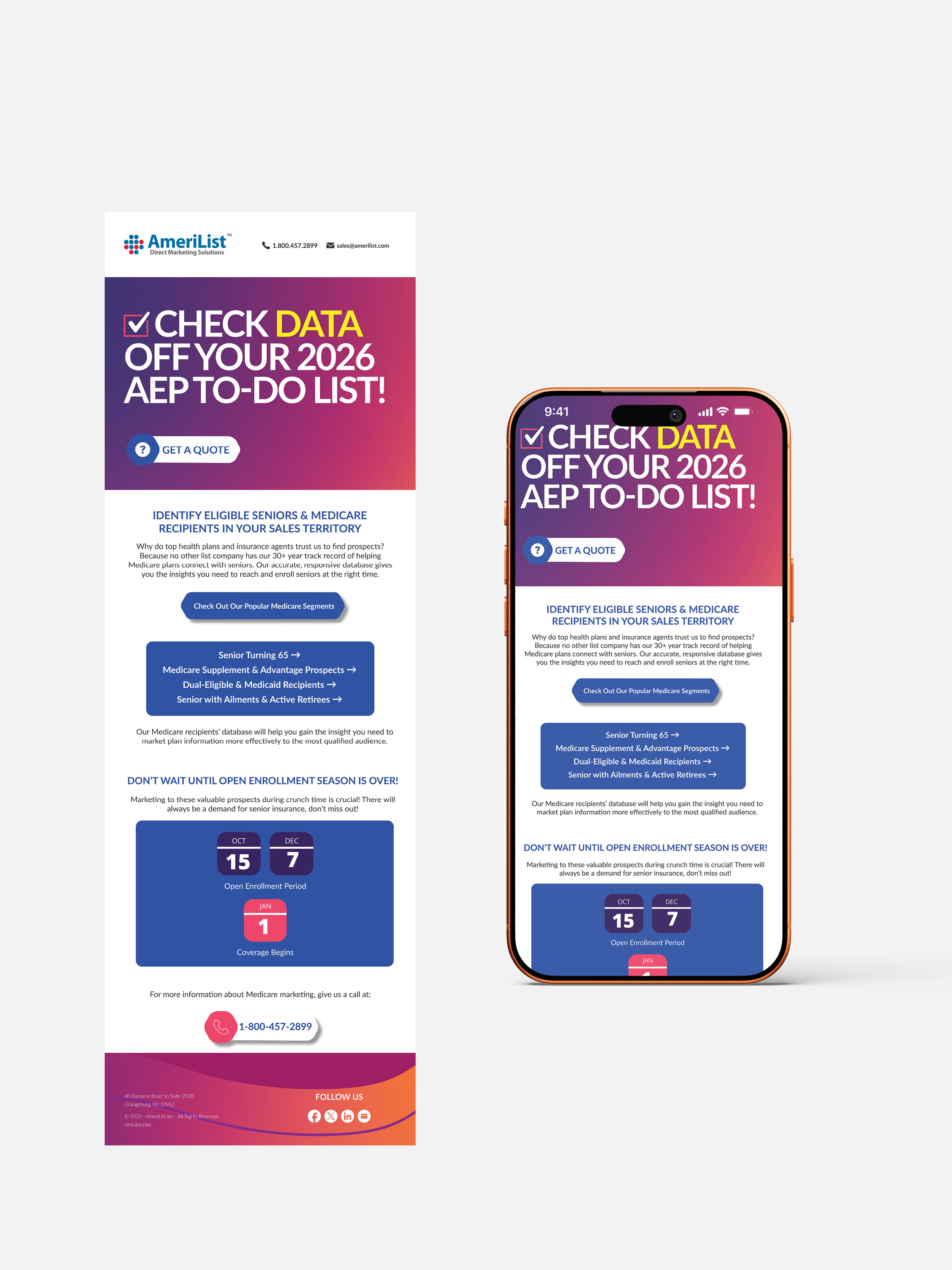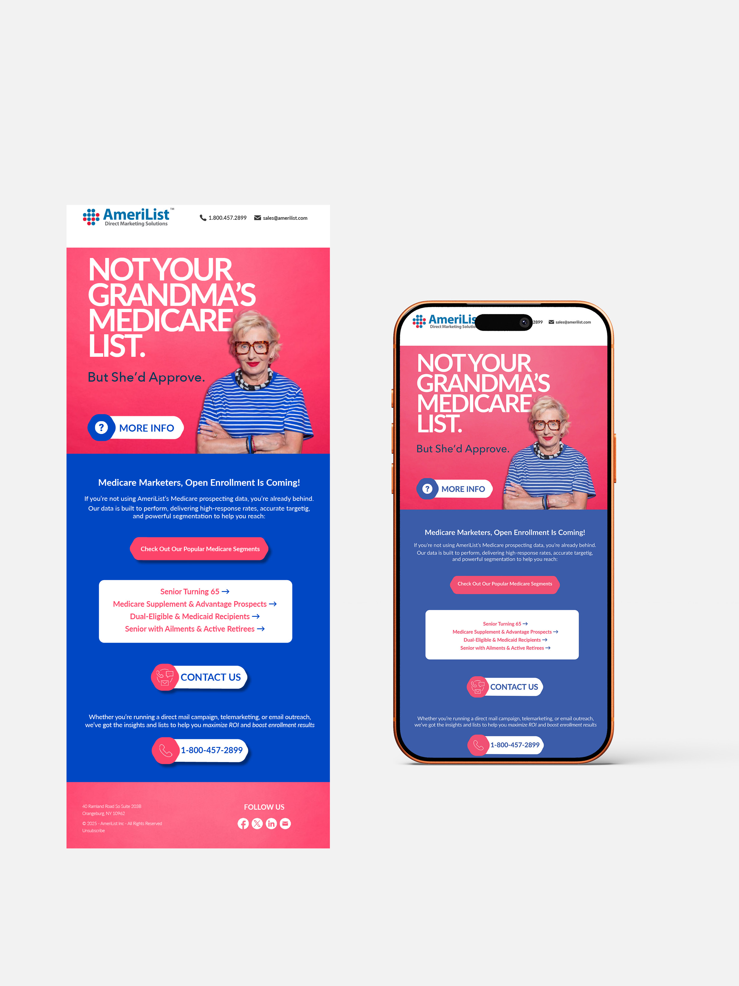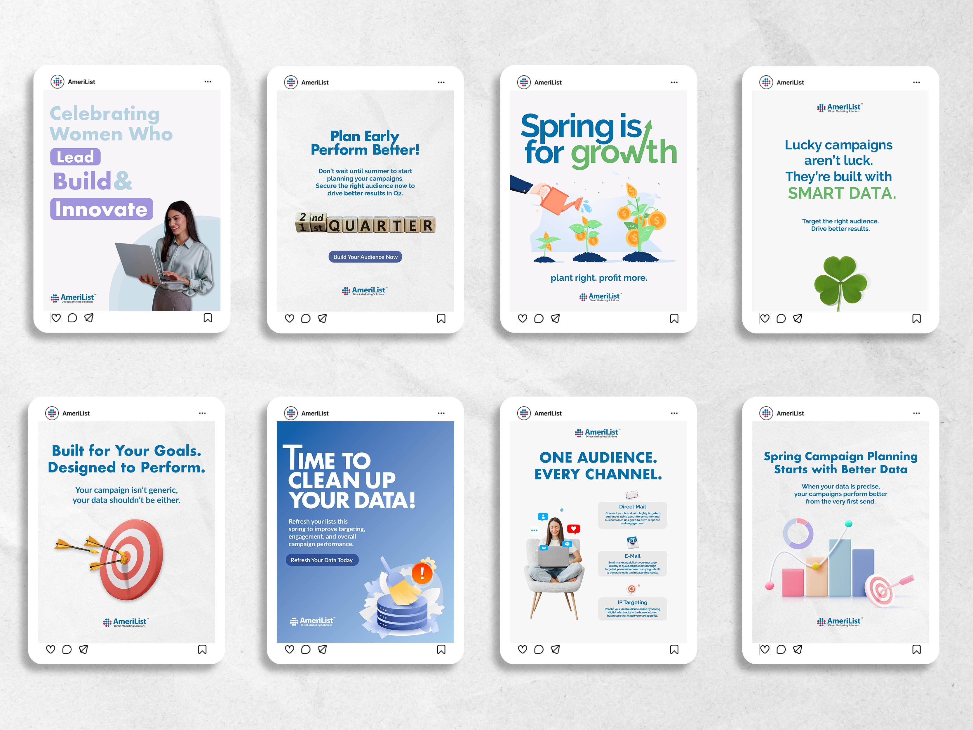 My work for AmeriList included designing a range of print and digital marketing collateral including brochures, email campaigns, social media graphics, and digital display ads, as well as direct mail pieces produced for both AmeriList’s internal promotions and client marketing campaigns.
